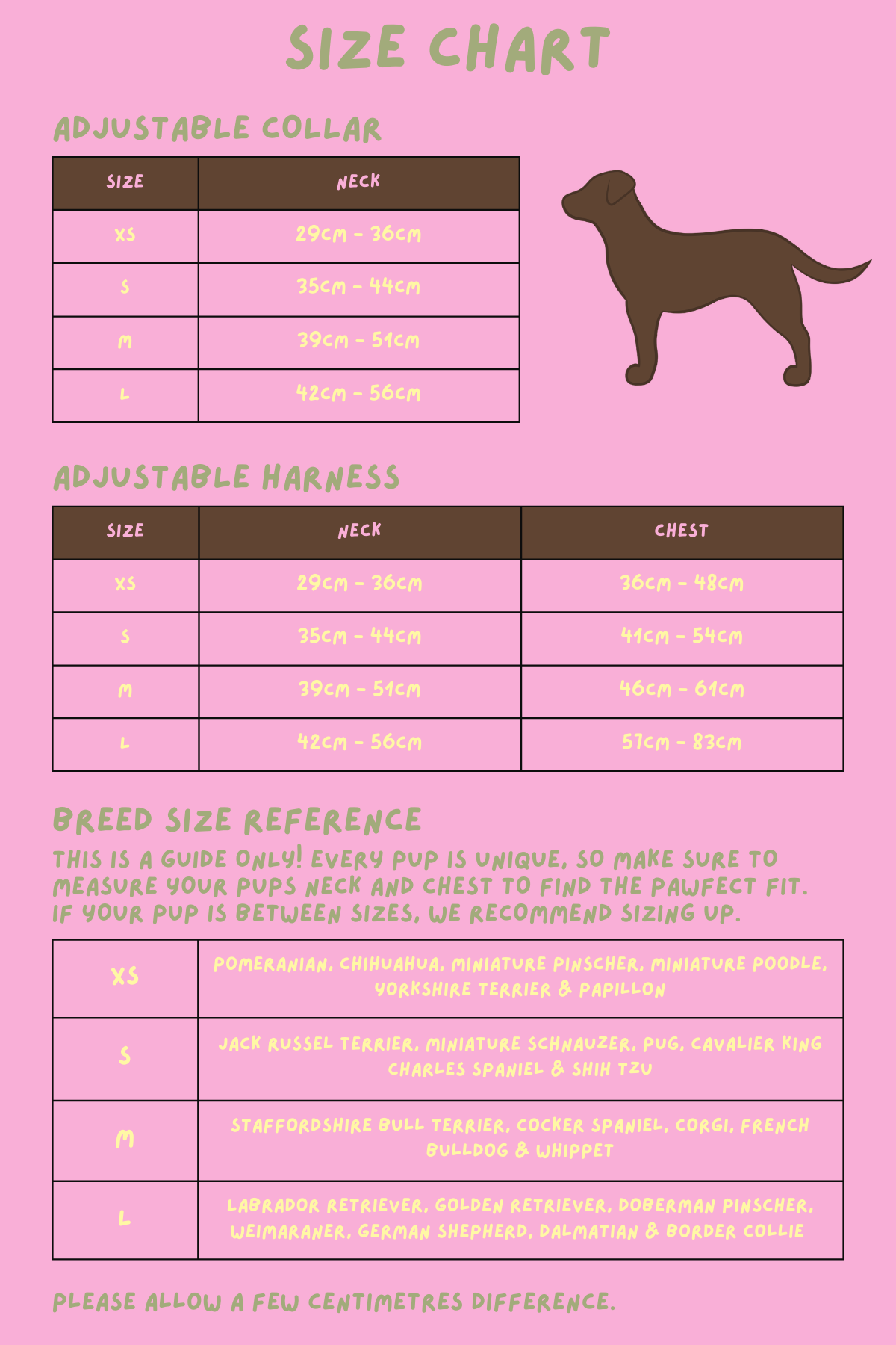 All dog accessories are subject to wear and tear from daily adventures and play. It’s the hooman’s responsibility to check straps, clip and fittings ect regularly to make sure your pup stays safe, comfy and stylish on every walk. Please allow a few centimetres difference. Design print will vary.